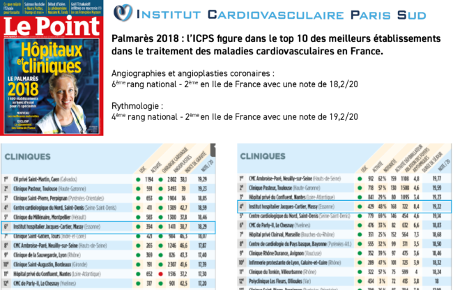 L’Institut Cardiovasculaire Paris Sud au palmarès 2018 des cliniques du magazine Le Point. C’est devenu un rendez-vous annuel. Jeudi 23 août, l’hebdomadaire Le Point publie son dossier spécial consacré au palmarès des hôpitaux et des cliniques en France. 1400 établissements ont été passés au banc d’essai pour établir les classements dans 73 spécialités. classement des…