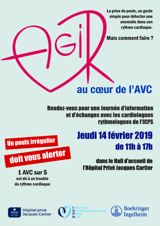 1 AVC sur 5 est dû à un trouble du rythme cardiaque. Le jeudi 14 février 2019, venez rencontrer nos médecins rythmologues lors de la journée sensibilisation patients sur la FA